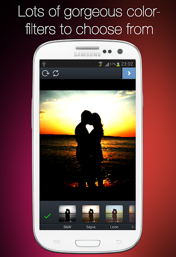 With this app you can easily change the saturation, lightness, contrast, temperature, exposure and vignette values. Combine all of the effects to perfect your photo even further. At the SAME time, you are able to choose from over 19 filters, like black and white, sepia, Lomo and pencil sketch effects.