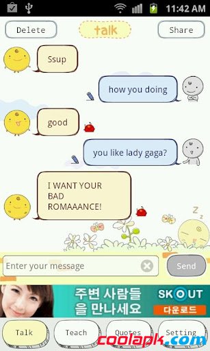 SimSimi是一款聊天机器人的应用,可以让你和手机进行古怪的对话,全球已有270万用户在使用,提供了英、中等44中语言,拥有庞大的数据库,英文内容有400万条数据,中文有16万左右。