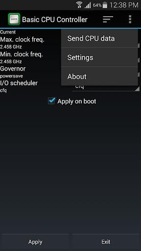 Be wary of the frequencies you select! Your phone may lock or become unresponsive if it doesn't like extreme values, but -hey- better safe than sorry: even though Basic CPU Controller allows you to choose if you want to apply the settings on boot, it comes with an extra "safety valve" too! If the device doesn't shut down (or reboot) in a clean way, it will not apply the settings, avoiding those nasty boot-loops you may have had with other overclocking apps. Please keep in mind that apps like QuickBoot are as quick as they are unsafe…