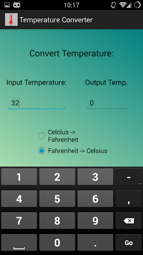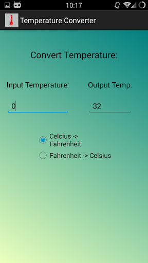 This is a very simple app that will convert an input temperature from Celsius to Fahrenheit. Or the other way around.