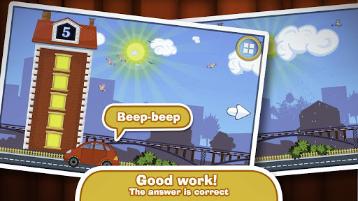 When an exercise is done, the sun rises and the story continues: cars start to drive, birds are flying and sun is shining brightly (a child just needs to tap on that object).
