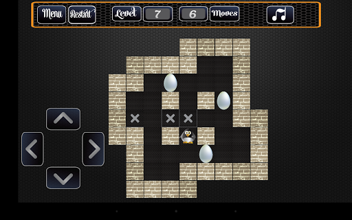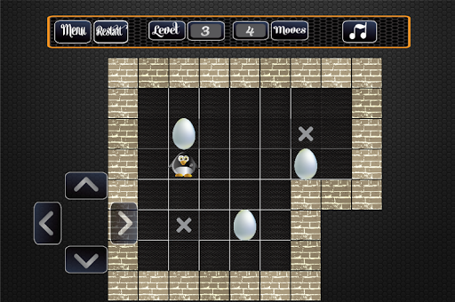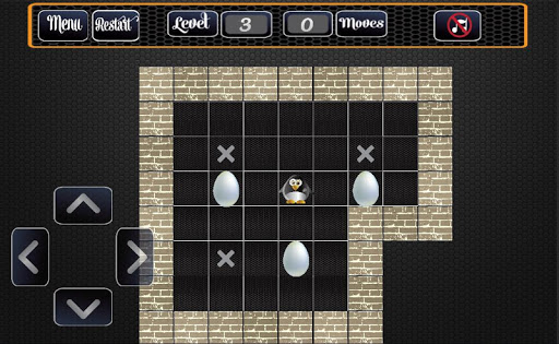 The penguin has been trapped in a dungeon. Now he must solve a difficult puzzle to get out of here. You must help him to move the heavy eggs and to place them on the special platforms. The less steps you make, the more points you get.