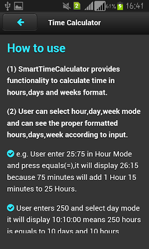 [1] SmartTimeCalculator provides functionality to calculate time in hours,days and weeks format.