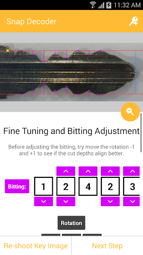 Snap Decoder is programmed with proprietary key edge detection algorithms. If your photo is on a plain, white background and in focus, the app will detect all the features of the key and calculate the bitting in seconds.