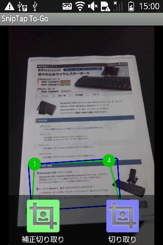 切り取りたい画像を撮影、または選択して切り取り範囲を左上から反時計まわりにタップしてください。