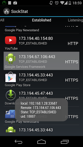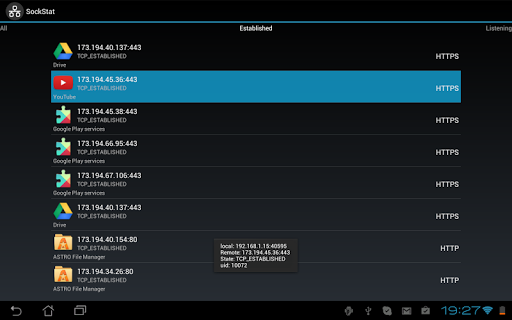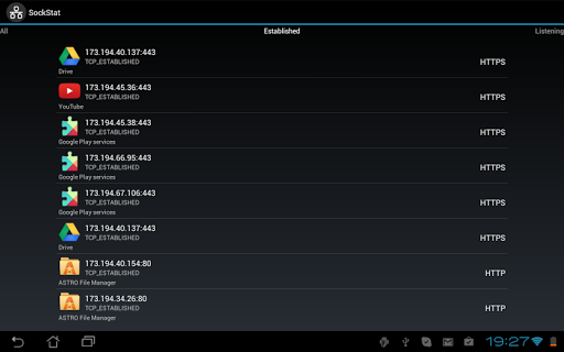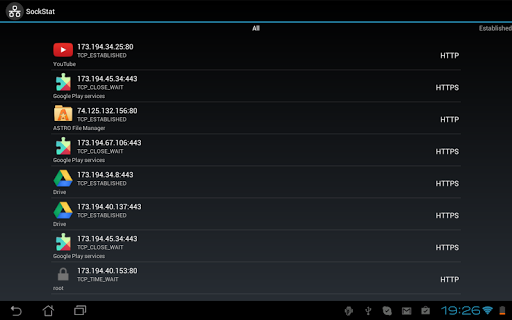 Sockstat lists all open UDP/TCP sockets on your device showing the related applications. Any suggestion is welcome. This app is totally free, no in-app purchases or ads.