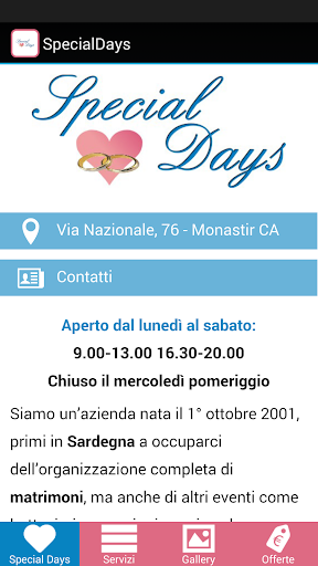 Con questa applicazione potrai conoscere i numerosi servizi offerti da Special Days, ricevere le loro offerte e le ultime novità tramite notifiche push, chiamare e inviare loro una mail con un solo click.