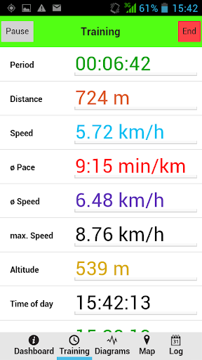 Training data like time, distance, speed, average speed, average pace, max. speed and altitude will be displayed and updated constantly.