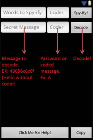 Ever wanted to just keep some things hidden? Don't want your "friends" on FaceBook reading everyone of your posts? Then use Spy Code! This app turns an ordinary message into a series for numbers and letters which can be changed back using this app. Just tell your friends about it and then you can communicate in code! You may be thinking, "Well, what if someone just downloads it and uses it to find out my messages?" Well here's the secret! This isn't a one code app, no, with this app you can make over 200+ individual codes! All you do is write your text, select a one character coder (a password that the receiver will need to know) and there you have it! An individual code out of 200+ possibilities to choose from. Enjoy!