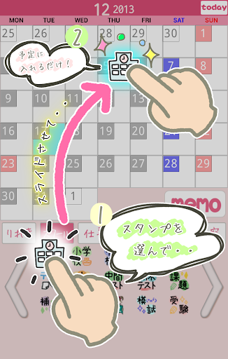かわいいスタンプをカレンダーにペタッと貼るだけで手軽に予定を登録♪