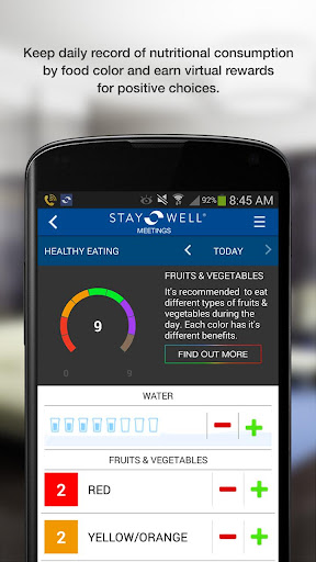 Nutrition and hydration are easily tracked by inputting individual, fruit, vegetable and water consumption throughout the day.
