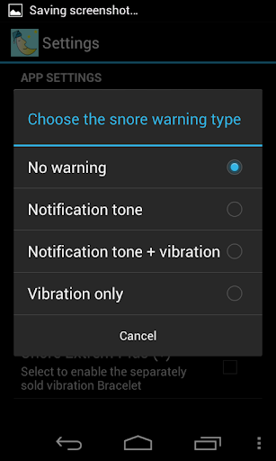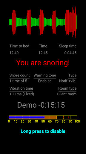 Snorek is a snore detection, monitoring and snore warning App. It interprets audio to identify the sound of snoring. It monitors the time of snoring and it can emit a warning tone. The user can set Snorek up and thus be warned when snores. Slide windows left to right or right to left to see all App parameters.