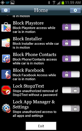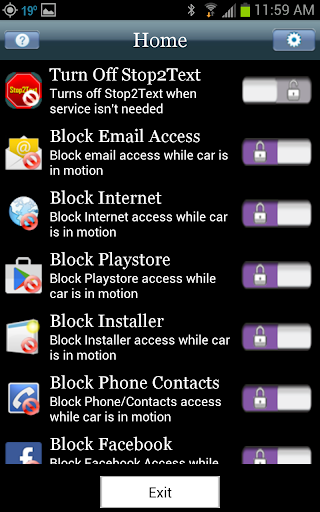 Stop2Text Pro kills distracted driving dead! Texting, Facebook, Emails, Phone and much more (you choose) will be instantly disabled with password protection when a vehicle exceeds between 10-20 mph.. Once the vehicle stops all functions return.