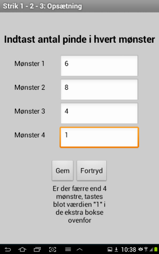 Bemærk: Alle værdier i setup-skærmen skal indtastes. Nuller accepteres ikke. Hvis et projekt har mindre end fire mønstre, skal værdier 1 indtastes for de ekstra mønstre i app’en.