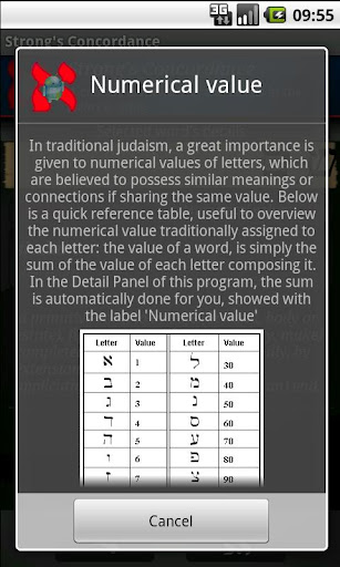 A complete app for the most comprehensive research within the Strong' Concordance: this program allows you to search any of the terms in the database of words, with the possibility to consult not only the etymological sense of the term, but also to see the word's rendering in Hebrew characters.