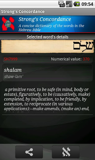 In order to extend as possible the versatility of the program, the app has been programmed to allow the opportunity to search for a word by typing directly the characters of the Hebrew alphabet. The searched terms could be shared by pressing the black share button on the detail screen, and be sent through BlueTooth, SMS, Facebook, etc.
