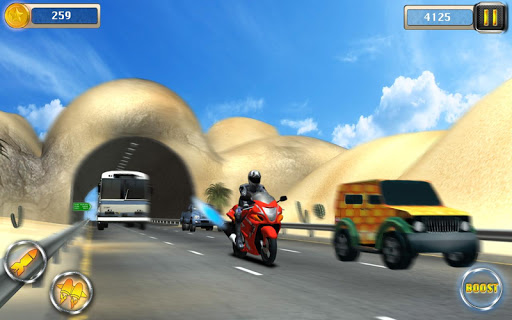Control your motobike with an easy controls during traffic rush time! The Awesome scene of game is dirt desert, tokiyo streets, Dubai city.