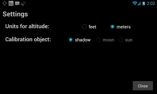 The 'CAL' button on the main screen is the calibration button. If you have not yet calibrated 'Surveyor Tools Pro', the button will appear green. To calibrate 'Surveyor Tools Pro' first select the object you want to calibrate with on the settings screen (Moon, Sun, Sun's shadow). Be careful when pointing at the Sun; use the Sun to calibrate only when it is cloudy and you can still see the Sun through the clouds.