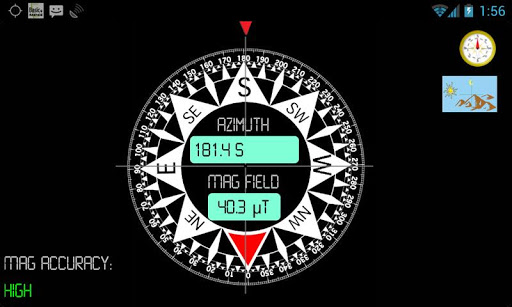 'Surveyor Tools Pro' includes three screens: the main screen and two different compass screens. One is a simple compass that is like a traditional compass with a moving needle. The other compass is more modern and displays a number of useful datums. These include azimuth angle with bearing and magnetic field strength, as well as the magnetic field data accuracy.