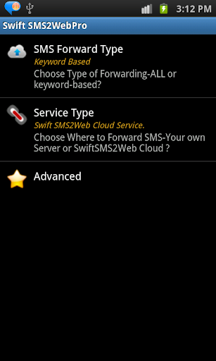 Sms2web Client for AndroidTM is an application to let you forward your desired incoming SMS, All messages , or on-a matching keyword basis to a server of your choice. Forward to your own server (PHP/ASP.NET/JSP etc..) or to Swift SMS2Web Cloud service.