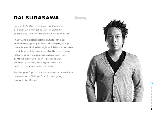 * Who is TOG? – Meet the TOG designers : Sebastian Bergne, Jonathan Bui Quang Da, Sam Hecht + Kim Colin, Ambroise Maggiar, Nicola Rapetti, Dai Sugasawa, Philippe Starck.