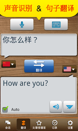 主要的特征:支持双方的4各语言会话翻译和地道的发音。