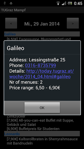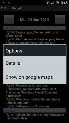 Zeigt verfügbare Restaurants/Menüs in der Nähe der TU Graz.