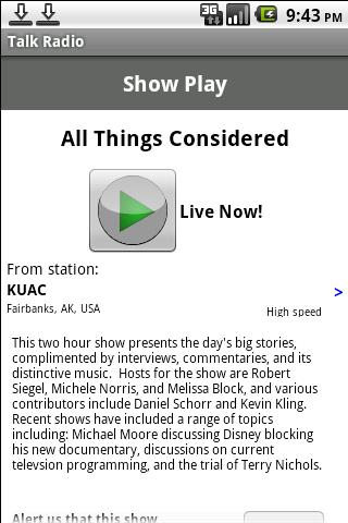 Listen to talk radio shows streaming live on internet radio. This application provides up to the minute show schedules and "one click to play" access to internet radio streams playing those top talk radio shows.