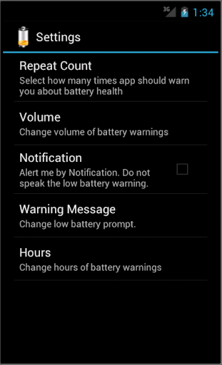 Talking Battery app reminds you about your battery's health. You can customize the app to either speak low battery health warning or a notification alert. You can also select working hours for this app. You can select the level of battery when it should start warning you about the battery health.