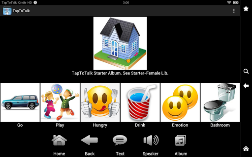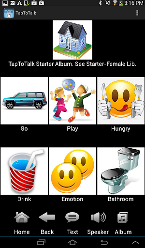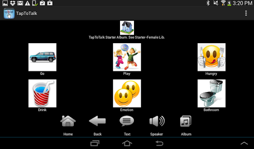 TapToTalk turns an Android Phone or Tablet into an augmentative and alternative communication (AAC) device. TapToTalk makes communication fun, like another “game” on this cool device. Just tap a picture and TapToTalk speaks. Each picture can lead to another screen of pictures.