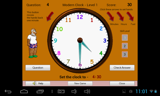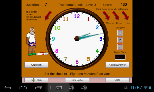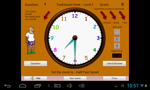 Learn to tell the time in my game that speaks the time to you, either in the modern way (digital), or the traditional way (quarter past, half past etc.). In the game you click a Question button and the time is spoken to you and shown on screen. You then have to set the hands to the correct time and you score points for getting it right. There are 3 levels of difficulty. In the first level the questions are only O'clock, quarter to/past and half past the hour. Level 2 adds 5, 10 past etc., questions and level 3 is the minutes in between. There is also a Practice level where you can set the hands to any time and hear the time spoken to you. Progress is rewarded with a certificate. Can be played landscape on a phone but best played on a tablet.
