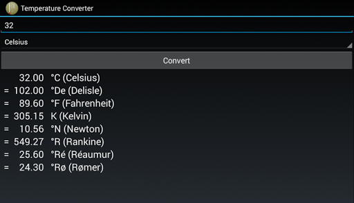 Type the temperature value, select the scale, tab on the Convert button and the converted values are shown below.