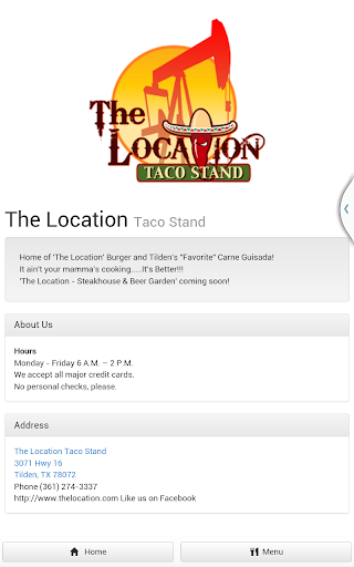 The Location Taco Stand is in Tilden, Texas. The application is used to display menu items and restaurant information.