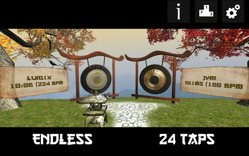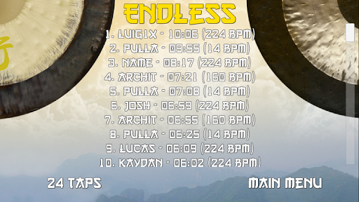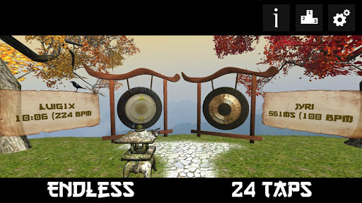 There are two different game modes in The Master of Time. Endless and 24 Taps. In Endless mode you can tap as long as you can with the chosen tempo. If you miss one bar the game ends. In 24 Taps mode you tap 24 times with the chosen tempo and your tapping accuracy is compared to the other players' scores in milliseconds.