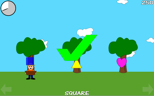The item kids need to catch from the trees will be mentioned at the bottom of the screen. A parent may be needed to read the catch phrase to assist in the learning process. Catching the correct item will reward the player with 50 points and a green check mark will show up on the screen, showing kids they got it correct.