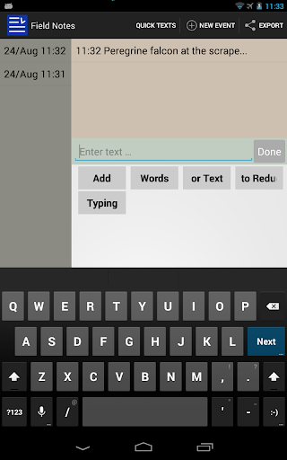 Timestamped Field Notes helps you with event recording in the field. Take behavioral observations and/or field notes; time-stamping each entry as you make it. More importantly it a allows you simply tap buttons to record the most commonly recorded events (or most used words), significantly reducing the need for typing. Fallback to the keyboard if and when required.