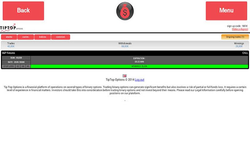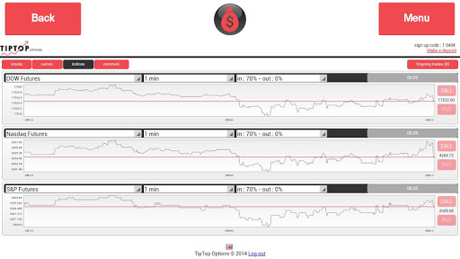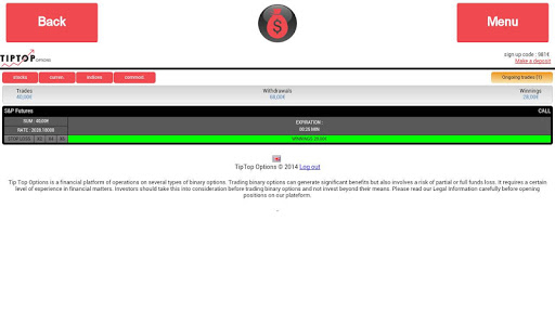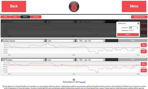 Take your Trades with you wherever you are. With TipTop Options app available for Android you will never miss an Option. Download the TipTop Binary Options Trader App and get access to all the Charts, Assets, Tools and Benefits of TipTop Options Platform on your Mobile Device.