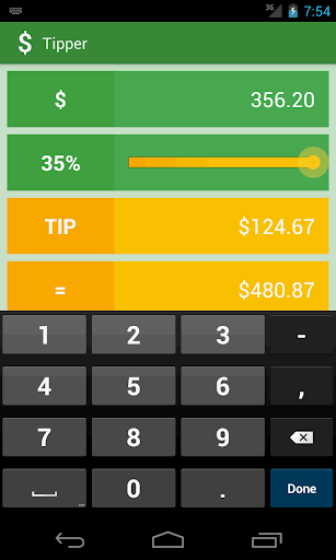 Calculate how much to tip. Simply enter the total amount of your bill, and you will be presented with the dollar amount of the tip, as well as the total bill amount (including tip). You can control the tip percentage using a slider, which ranges from 1% to 35%.