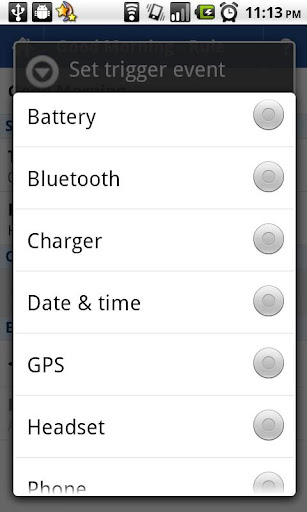 * Monitors system for 11 different events - location, incoming & outgoing calls, time, date & time, battery events, charger events, car/desk dock events, headset events, bluetooth events and wifi events