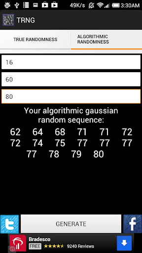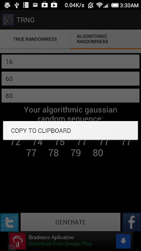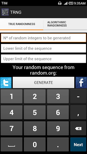 This app can generate True* Random Numbers (sequences) and Pseudo-random or Algorithmic random numbers (sequences). The numbers can be copied to clipboard or shared through facebook and twitter.