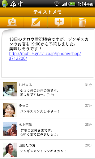 コルクボードにはメモ、写真を貼り付けてグループのメンバーで共有ができます。