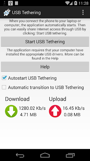 Usb Tethering is a simple application that shares Internet connection from your smartphone to your computer through usb connection. When you connect the phone to your laptop or computer, the application automatically starts. Then you can easily share Internet access through USB by clicking: Start USB tethering.