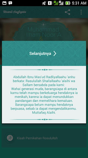 Aplikasi dilengkapi dengan Rute perjalanan, Ucapan selamat, Hadist tentang Pernikahan dan Kisah pernikahan Rosululloh SAW.