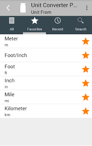 A small number of the most popular categories and units is already preselected as Favorites upon the installation of the Unit Converter PRO. These preselections include common categories and units such as Currency (US Dollar, Euro or local currency), Length/Distance (meter, foot/inch), Temperature (degree Celsius, degree Fahrenheit), Weight/Mass (kilogram, pound) or Velocity/Speed (kilometer per hour, mile per hour). You will likely want to modify these preselections by choosing from the converter's 90 categories and more than 1900 units and adding them to Favorites. In this way, you'll customize the converter to precisely match your needs.