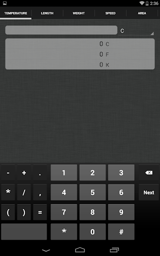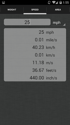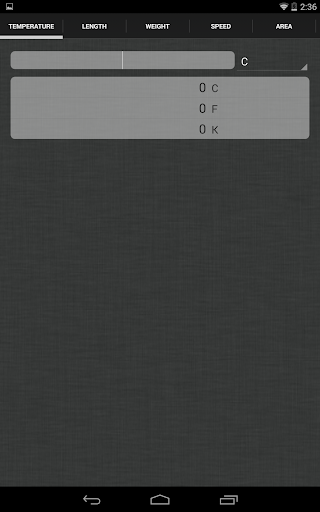 Unit Converter allows the user to convert between the following unit types: Temperature, Length, Weight, Speed, Area, Volume, and Time.