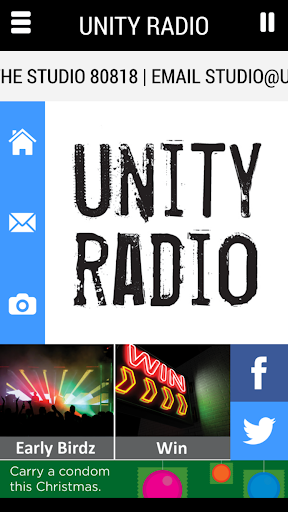 The Unity Radio App lets you listen to the station, contact the studio via email, picture message, Facebook and Twitter and also see the latest from our website.