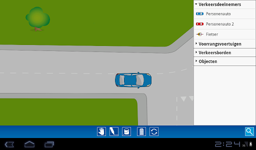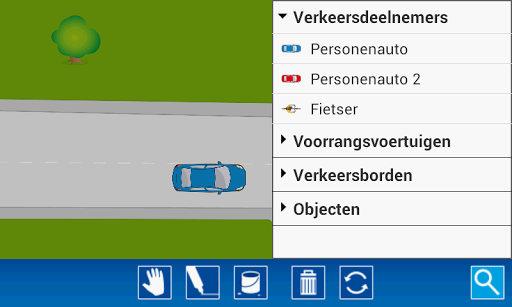 • Op de situatie kunnen verkeersborden, verschillende verkeersdeelnemers en objecten (huizen, bomen etc) geplaatst worden. Bepaalde verkeersborden en objecten zijn reeds geplaatst op een kruispunt om zo snel een situatie te kunnen tekenen. Er is een ruime keuze aan situatie’s (meer dan 25), verkeersborden (de belangrijkste), diverse verkeersdeelnemers (voetganger, verschillende motorvoertuigen en voorrangsvoertuigen(politie, brandweer en ambulance)) en objecten waaruit gekozen kan worden.