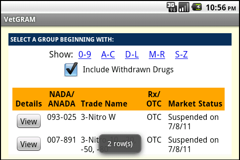 This mobile version was developed at the University of Florida's College of Veterinary Medicine, Gainesville, Florida, USA. It is based on information in VetGRAM (http://www.farad.org/vetgram), which is one of the information resources provided by the Food Animal Residue Avoidance & Depletion Program (FARAD Program).