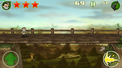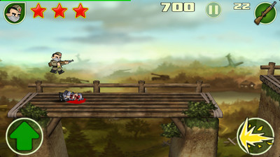屏幕下方有虚拟按键进行射击战斗,而且需要跳跃,节奏相当的快!玩起来很有魂斗罗的感觉!