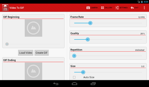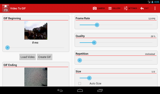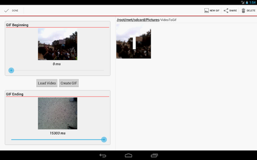 Keep it mind that you're using a mobile device and memory and other resources are limited. You can view the gif specs at the end of the main window. When gif is created touch and hold for view it in the gallery.